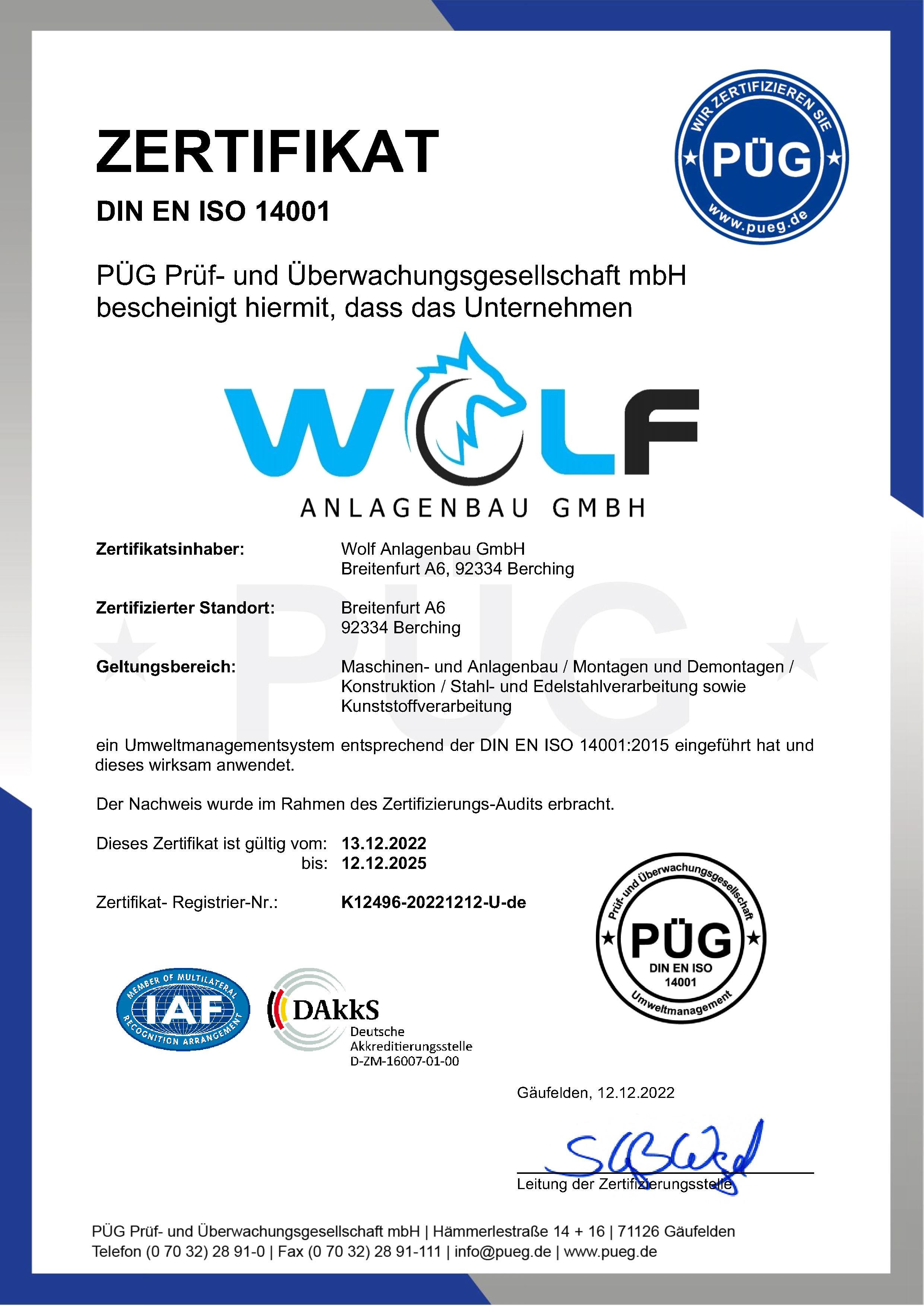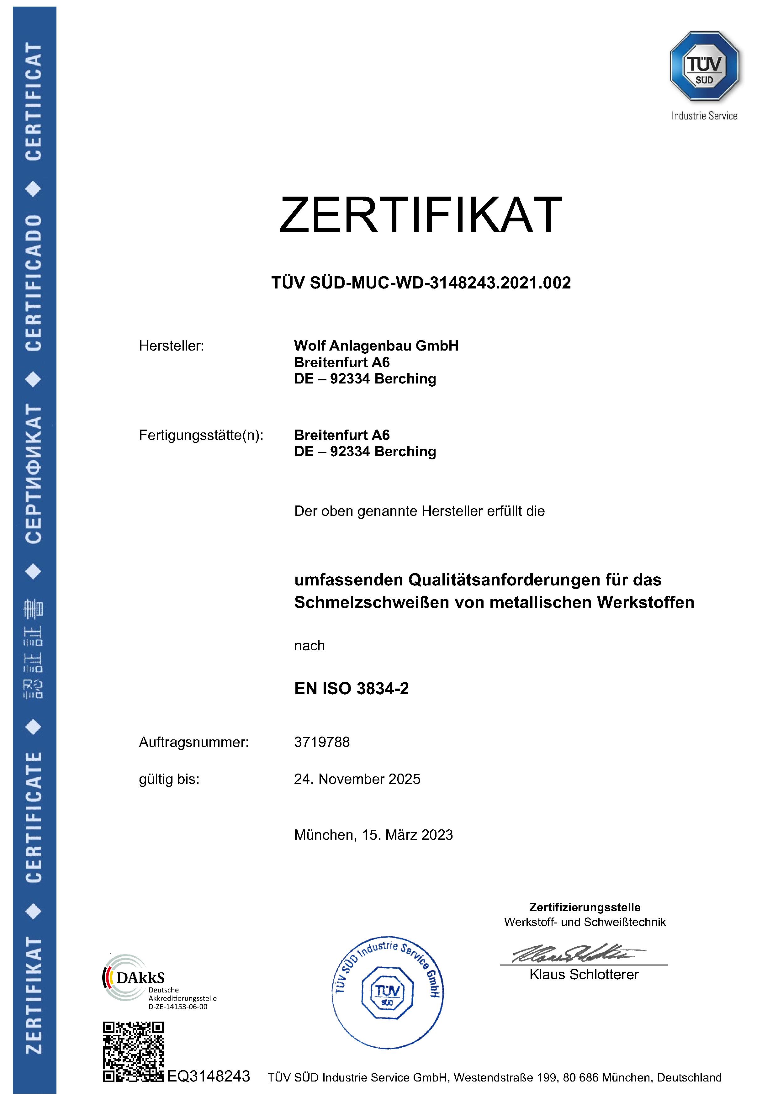 Die Wolf Anlagenbau GmbH ist ein QSGU zertifiziertes Unternehmen nach ISO-Standard.